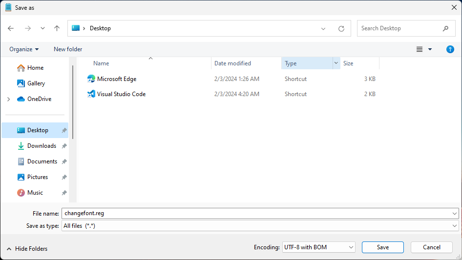 다음과 같이 저장한다. 메모장 > 다른 이름으로 저장에서 파일이름 뒤에 reg 확장자를 붙여서 저장하고 타입은 All files(모든 파일) 선택.