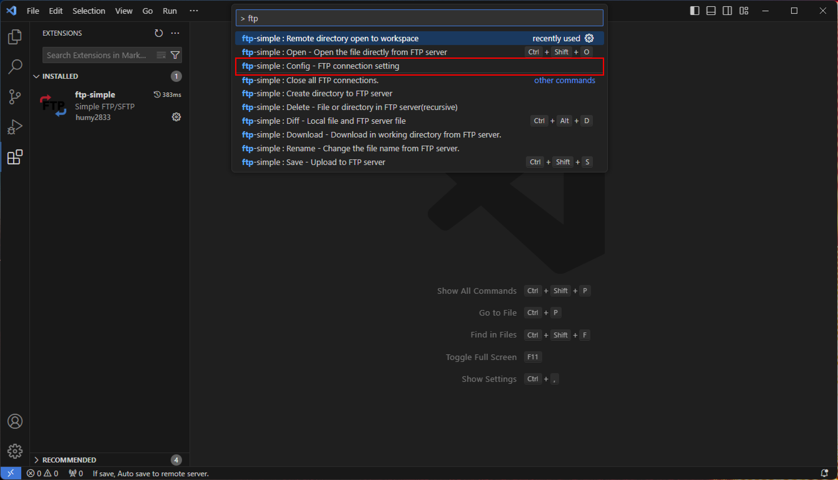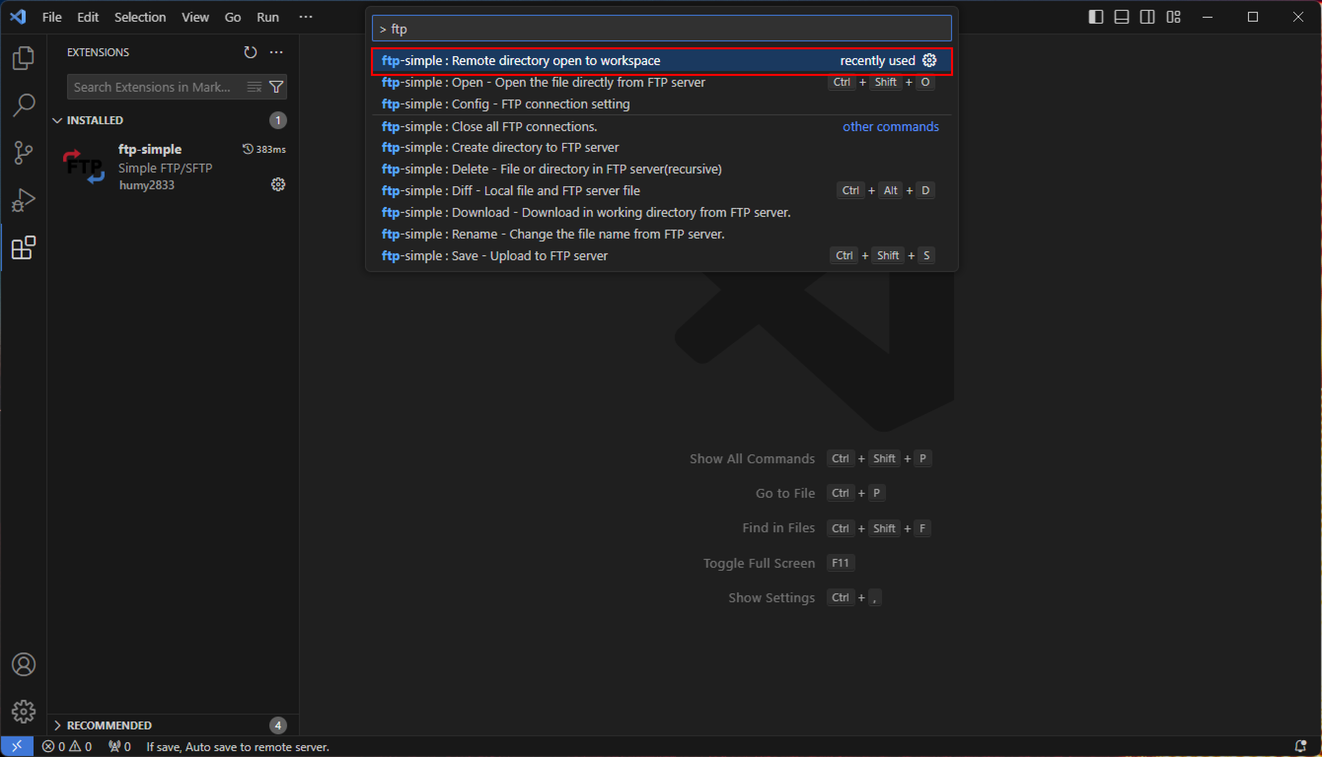 그리고 다시 상단 검색에 > ftp-simple을 입력하면 리스트가 나오는데 여기에서 Remote directory open to workspace 클릭한다.
