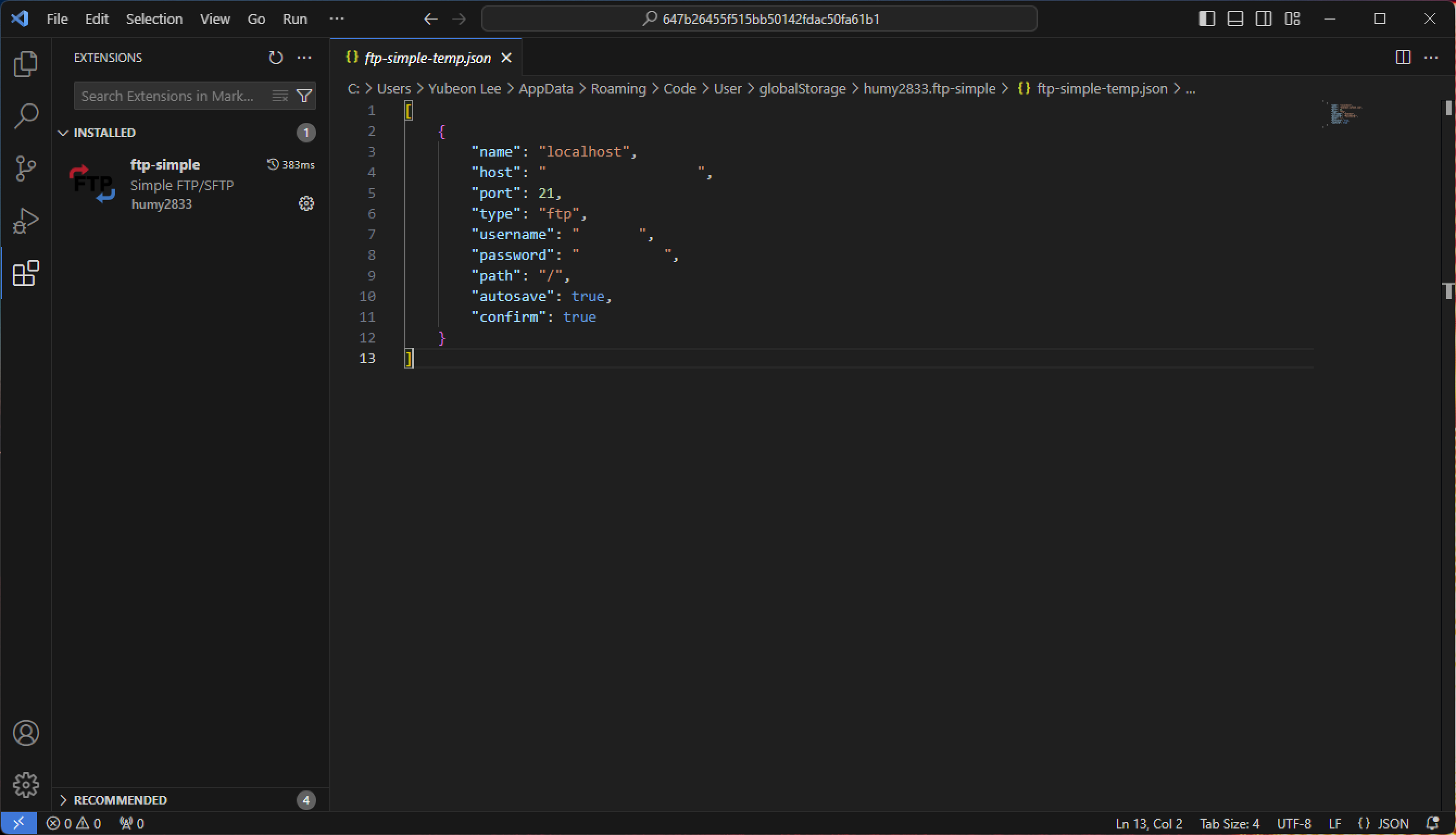 이미 나는 ftp-simple을 설치했는데, 좌측 사이드바 아래쪽 퍼즐 같은 아이콘 선택하고 바로 위에 extentions에 검색해서 ftp-simple를 선택하고 설치(install)한다. 설치는 금방 된다.