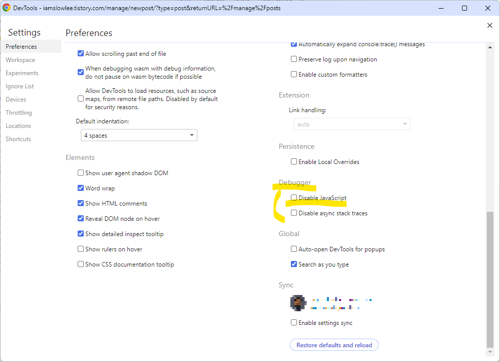 그럼 아래와 같은 화면으로 바뀌는데 여기에서 스크롤을 내려서 우측이나 아래쪽에 보면 '디버거(Debugger)' 섹션에 'disable javascript'를 체크해준다.