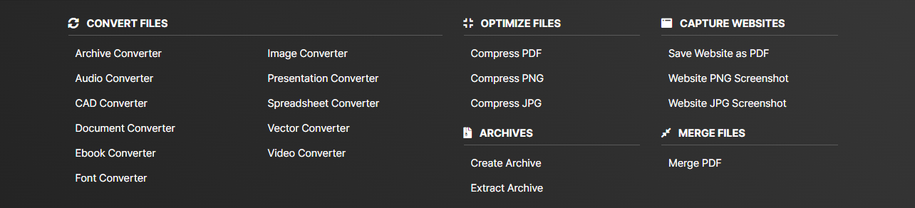 Compress Merge Capture Website Create Archive Extract Archive Convert +200 Formats Supported CloudConvert is your universal app for file conversions. We support nearly all audio, video, document, ebook, archive, image, spreadsheet, and presentation formats